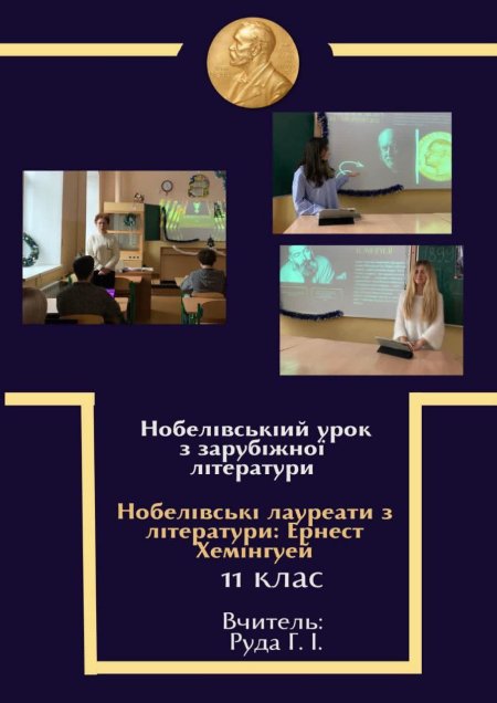 Одинадцятикласники Предславинського ліцею 56 традиційно в грудні зацікавилися лауреатами Нобелівської премії в галузі літератури. Учні підготували креативні проєкти, презентували власні дослідження творчості лауреата Нобелівської премії Єрнеста Хемінгуея, показали глибоке осмислення твору "Старий і море".Ця робота спонукала сучасних молодих людей до усвідомлення того, що здобуття цієї престижної премії - це перш за все наполегливий труд, віра в себе, цілеспрямованість, а не тільки геніальність; що велич людини в тому, щоб вистояти і не здатися, прагнути до перемоги, що кожен із них у майбутньому може стати частиною великої історії.