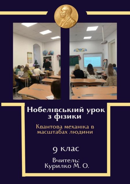 11 грудня в 9-му класі відбувся нобелівський урок з фізики за темою "Квантова механіка в масштабах людини". На ньому діти розглянули, що таке квантова фізика, як працює ефект тунелювання і які перспективи відкриваються перед світом завдяки відкриттю трьох вчених-фізиків.