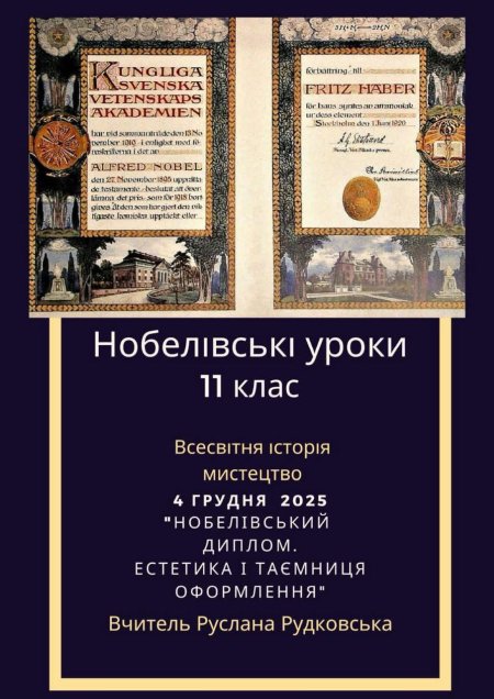 У Предславинському ліцеї №56 відбувся особливий інтегрований урок з мистецтва та всесвітньої історії в 11 класі (учитель Рудковська Р.А.), який перетворився на інтелектуальну подорож у світ символів, ідей та візуальних сенсів. Тема уроку — "Естетика і таємниця оформлення Нобелівського диплому" — дала змогу поглянути на Нобелівську премію не лише як на вершину наукового й гуманістичного визнання, а й як на культурне явище світового масштабу. Учні дізналися, що кожен Нобелівський диплом — унікальний арт-об'єкт, створений шведськими та норвезькими художниками вручну. Говорили про спадкоємність класичної європейської традиції, про використання античних образів, алегорій світла, істини, знання, миру, про мову кольору, лінії та композиції, яка "розповідає" історію відкриття або служіння людству без жодного слова. Особливо цінним стало усвідомлення того, що мистецтво тут не є прикрасою, а носієм пам'яті та смислів. Нобелівський диплом постає як символ діалогу між минулим і майбутнім, між наукою й культурою, між особистим досягненням і загальнолюдськими цінностями. Цей урок став прикладом глибокої міжпредметної інтеграції, що формує не лише знання, а й ціннісне мислення, естетичну культуру та здатність бачити за формою — ідею, за образом — історію, за нагородою — відповідальність.