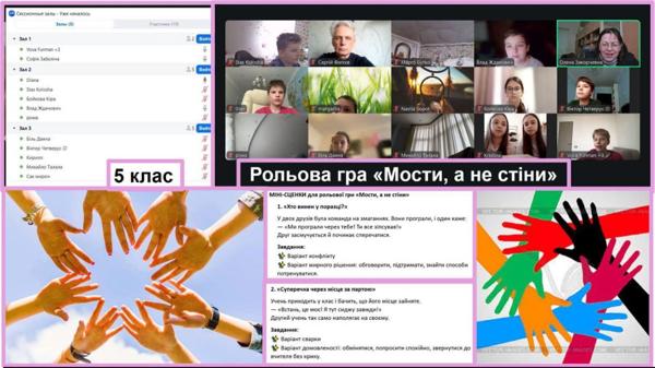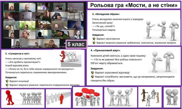 Під час класної години у 5 класі за участю шкільного психолога було проведено рольову гру "Мости, а не стіни", спрямовану на розвиток навичок конструктивного вирішення конфліктів. Учні працювали в малих групах, аналізували запропоновані життєві ситуації та розігрували можливі способи мирного розв'язання непорозумінь між однолітками. У процесі обговорення діти вчилися висловлювати власні почуття, слухати інших та шукати компромісні рішення. Заняття сприяло формуванню навичок співпраці, взаємоповаги та відповідальної поведінки у конфліктних ситуаціях.
